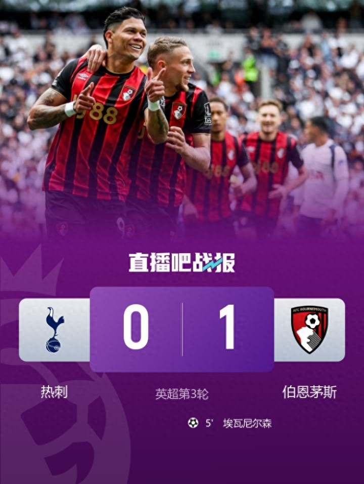 直播吧8月30日讯 北京时间8月30日22:00,英超第3轮,热刺坐镇主场新托特纳姆热刺球场迎战伯恩茅斯。上半场,埃瓦尼尔森闪击破门,亚当-史密斯伤退。下半场,维卡里奥连续扑救救险,贝里瓦尔抽射造险,双方均未能改写比分。全场比赛结束,热刺主场0-1不敌伯恩茅斯,两连胜遭终结,赛季首败。